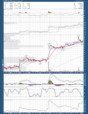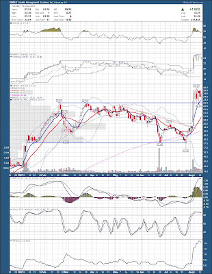 While the markets are pretty overbought in the near term, there are still some stocks close to safe entries on the long side. I mentioned how HMSY broke out of a nice base a month ago, and while it did move out, it came back for a retest of support the past week or so. While there is a chance that HMSY had a false breakout and may of topped, you still have to favor the underlying trend until it is proven. HMSY is now sitting on it's 20 day sma, after a nice move on Fed Tuesday. It may consolidate a few more days, but I believe there is a good chance that it moves to fresh new highs soon.