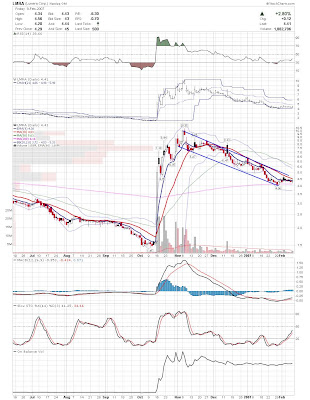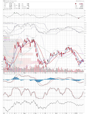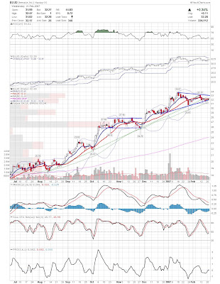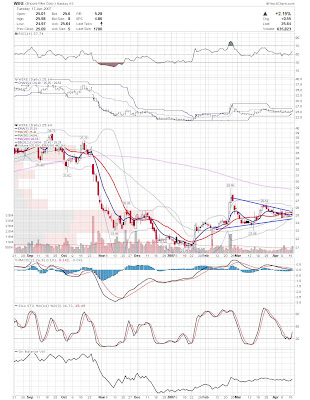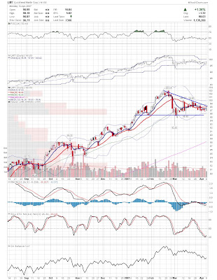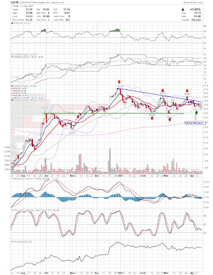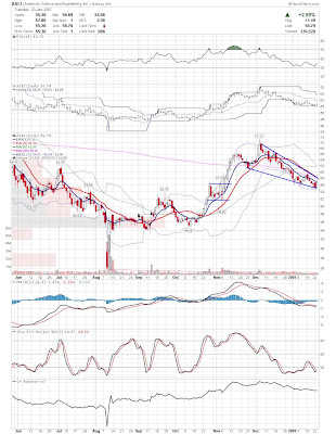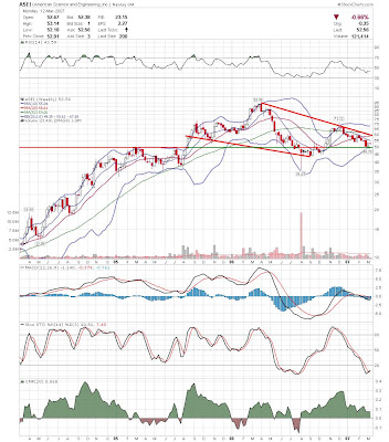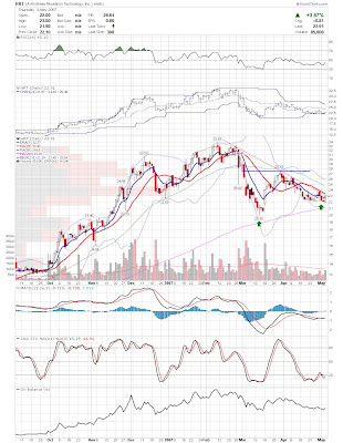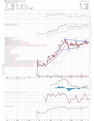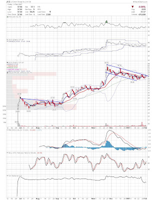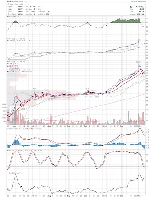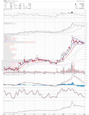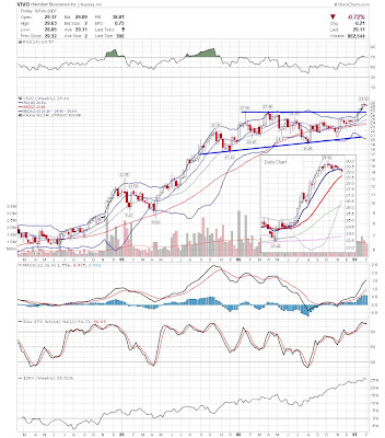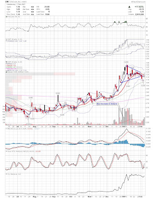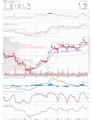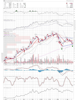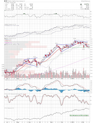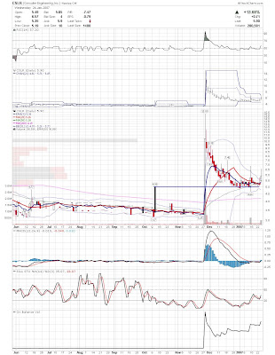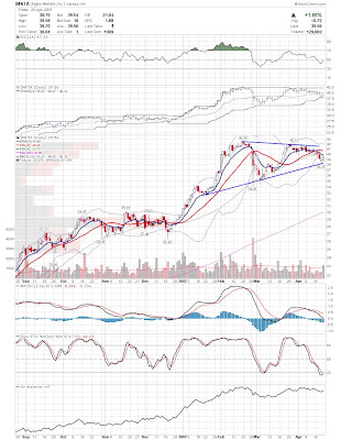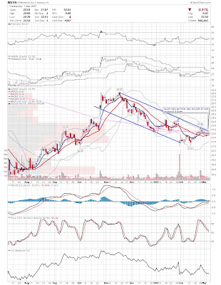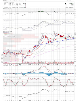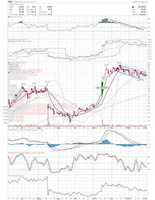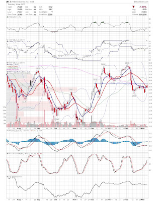 A daily chart for HURC follows below. While HURC has been on a tear recently, and has weathered the correction fairly well, I can't get all that excited about it here because of the state of the market. It could hold here at the rising 20sma, but my gut is telling me it will have an ABC correction with only the down A wave complete here. I would guess that the rising 50sma and lower bollinger band will be tested, which may offer a great entry depending on the market condition at that point. A couple of things that stand out to me here is the nice increase in volume recently, and the fact that the indicators are in synch.