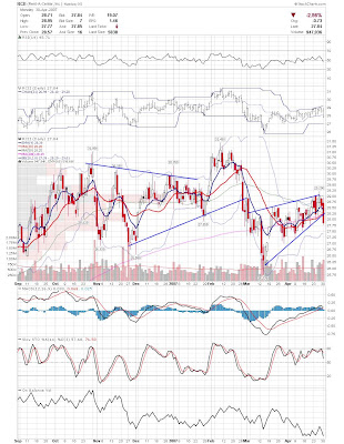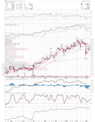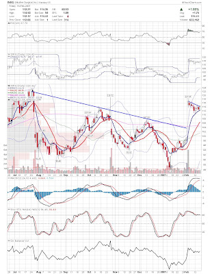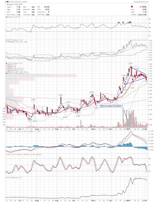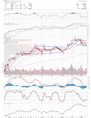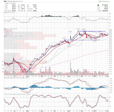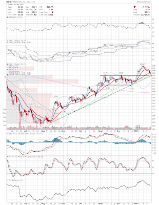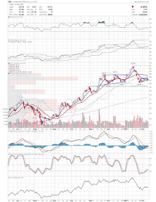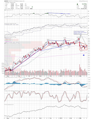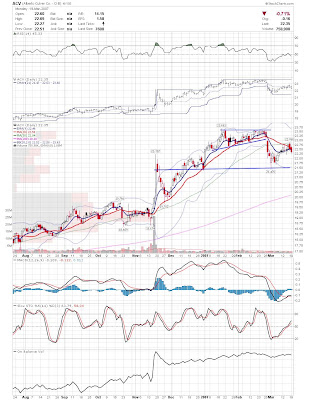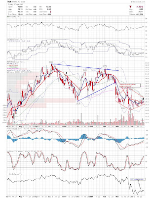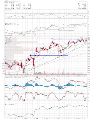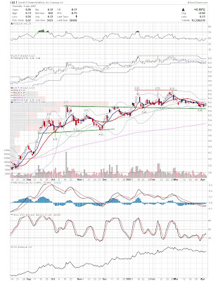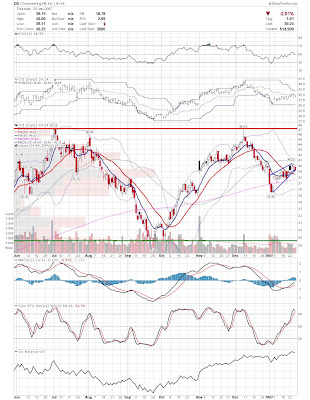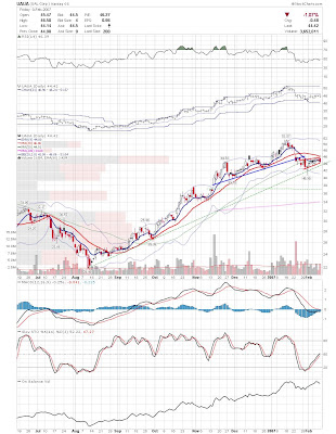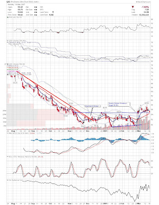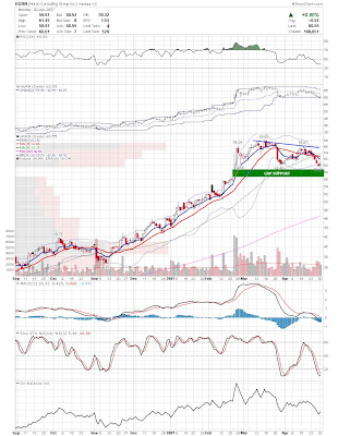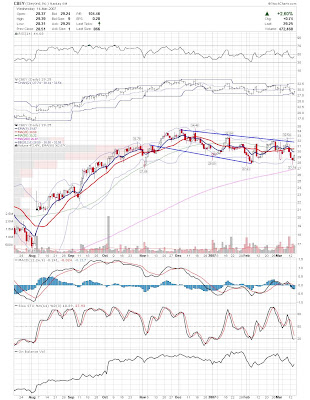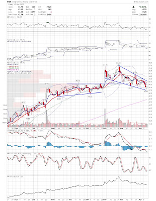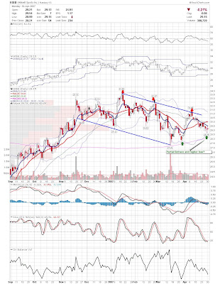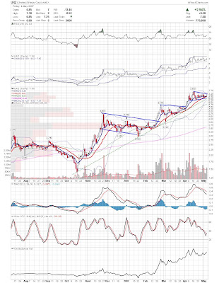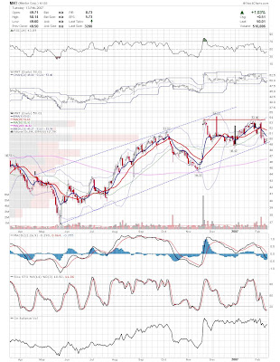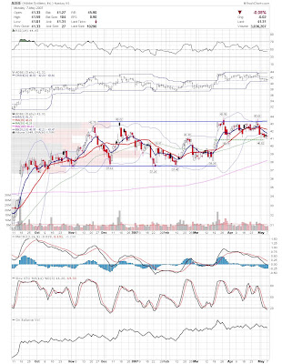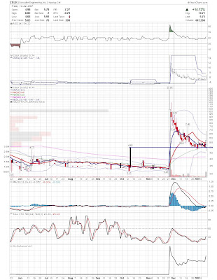 A daily chart for HURC follows below. While HURC has been on a tear recently, and has weathered the correction fairly well, I can't get all that excited about it here because of the state of the market. It could hold here at the rising 20sma, but my gut is telling me it will have an ABC correction with only the down A wave complete here. I would guess that the rising 50sma and lower bollinger band will be tested, which may offer a great entry depending on the market condition at that point. A couple of things that stand out to me here is the nice increase in volume recently, and the fact that the indicators are in synch.