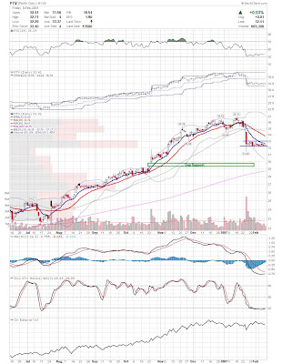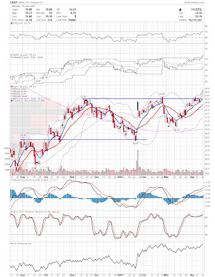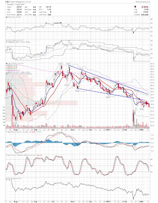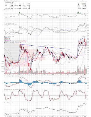 The first play is if there is more left to this bounce. I am looking for stocks that are on their lower bollinger bands with oversold indicators. I then look for a narrow range or hammer type candle that I can use to trade off. FDO below is a good example. It is clearly oversold, and had a nice narrow range day today. If the general market is behaving appropriately, and FDO trades above todays high, then I think the odds favor a long position. The target on these types of trades is fairly aggresive, near the 9ema for a partial sell and middle band to close the position. This is a little risky in this environment, but the tight stop may make up for it. This type of play should not be treated as anything other then a long scalp.