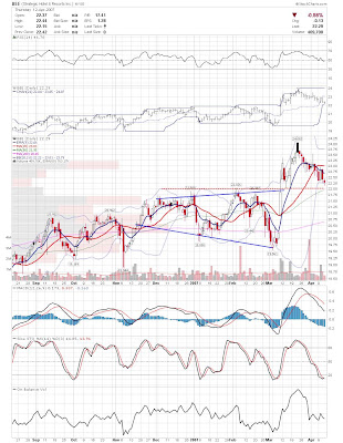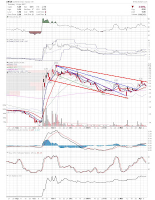 BLUD is also close to do or die time, as it needs to either get back over the ascending trendline or possibly continue the corrective phase.