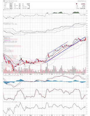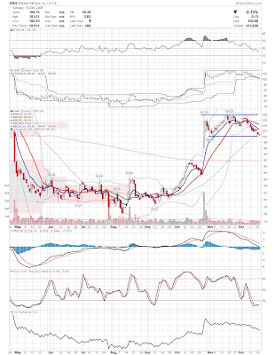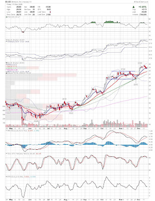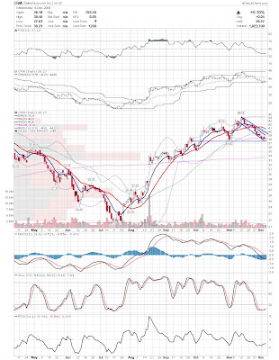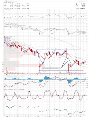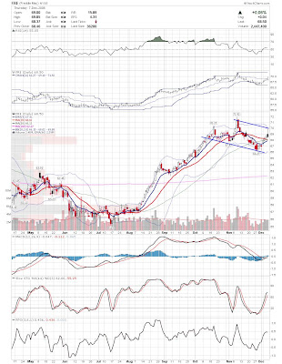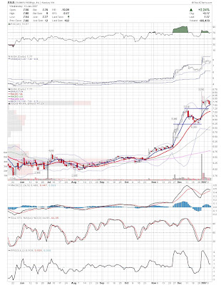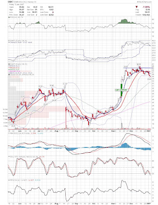First up is SINA. This is one where I was right on the overall direction but entered early. My first entry was as it touched the lower band and made the first turn higher. I was stopped out fairly quickly, and entered a few days later. I sold a little as it backed off the 20sma and was stopped out two days later. It was a losing trade which I'm ok with. I know I will be wrong half the time I trade and my plan accounts for that. The mistake I made was taking it off my radar as it setup very nicely a few days later. While I wouldn't of caught the entire move, as some of it was earnings related, I would of had a nice gain if I would of waited for the second touch of the band.