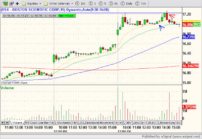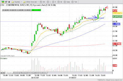 Last week I posted a bearish flag alert for SNDK. I was day early on the call. In fact the morning after I posted my alert, SNDK gapped up invalidating the setup. However, by the following afternoon SNDK had succumbed to the weakness inherent in the setup and we realized that the previous day's rally was a dead cat bounce. The picture above is the 15 minute timeframe of last week's price action.