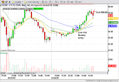 TWLL was another potential NR7 play that I posted this morning. As I mentioned, it is not very liquid and so not for everyone's taste. After a quick lift on the open, it chopped around a bit before heading back up towards resistance. At resistance, it traded sideways for a long time until the rising 10 period EMA caught up. This presented a low risk dummy entry on a break of Monday's high. Lots of slippage on the entry, but it moved very nicely after that. In order to avoid slippage on the exit, I let it go when it appeared to be carving out a lower high.