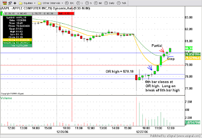 RIMM was set to crater from two downgrades this morning. Yesterday's NR7 bar hinted that the expansion would be quick. There was no low risk entry off of the OR, so I decided to scale into the position starting with 100 shares on a break of the OR low. This is a pricey stock and errors can be costly, hence the scaling in tactic. When price showed me that it was not going back to test $132, I added another 100 shares and when price took out the second bar low, I added another 100 shares. My target was $130 because round numbers tend to have strong psychological meaning for support and resistance. My original stop was $1.00. By the time price broke $131, I tightened the stop to $132.