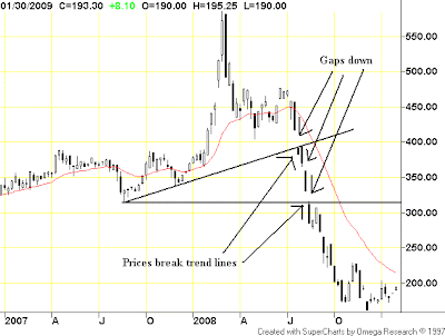 On the weekly chart, notice the prices had some really big gaps down starting at the end of the second quarter. Also note the prices moved through key technical support levels as well.
