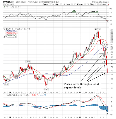 In other words, this is a classic bear market chart. However, also note that prices are moving in a wide consolidation range right now. The most extreme reading of this range would be 84-108. However, I think the real bottom would be around 90, closing the range to 18 points. I'm thinking the market is going to consolidate in this range barring another unforeseen random economic event.