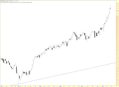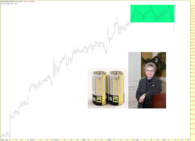 The Dow's high on June 1 was about 13,690. Its low on June 8th was about 13,250. That's a 440 point difference, and that's the approximate range of the rectangle out of which it just emerged. By traditional measurement, you take the high of 13,690 and add 440 points and get the target of 14,130. That's 223 points or 1.6% away. It won't take much to get us there.