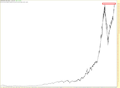 I rarely use arithmetic scale, but I am going to do so here on the S&P 500 to make a point. What I want you to see is the amazing drama that has taken place over the past quarter century, with the S&P exploding to a high in January 2000, collapsing terribly in a bear market, and then flying yet again to the prior high. Is this the mother of all double tops? Only time will tell. Although the bulls that visit this blog certainly would say no.