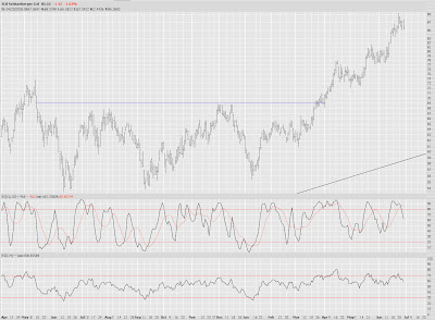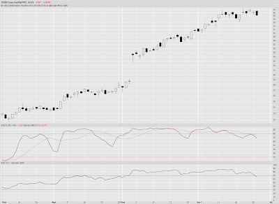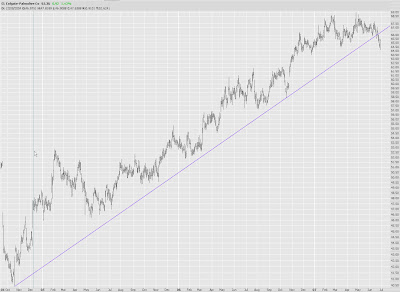 The Russell 2000 is below its supporting trendline, but this trendline isn't horribly significant. In other words, I don't put a heck of a lot of weight into the fact that it is broken. I'm glad it's broken, to be sure, but there's still a fair amount of support at these price levels.