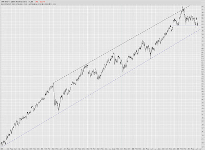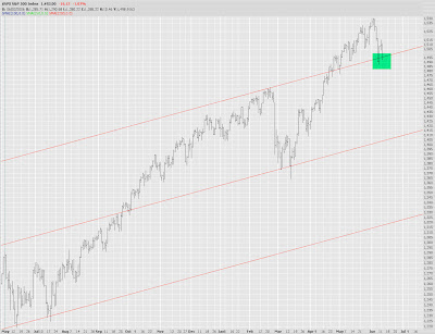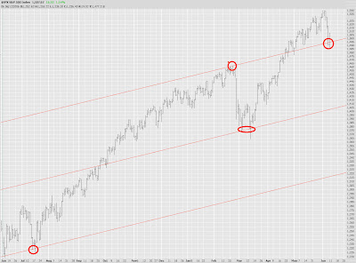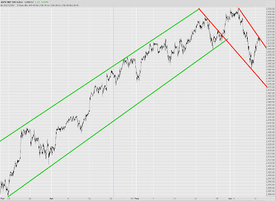 Phew. OK. Back to the markets. As I said earlier, I'm more bearish than normal. Which is saying something. Part of the reason is that, viewing the $SPX minute graph, I sense a sea-change has taken place in the trend. I've drawn it below. |