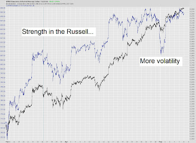 More than one person has scolded me for not showing some Fibonacci extensions on the markets. Well, let me give it a shot, although I'm not sure how helpful these are. First, here's the Dow 30. According to the extension displayed, we've got a ways to go - the next Fib level is at 14,563, well over 1,000 Dow points above the current level.