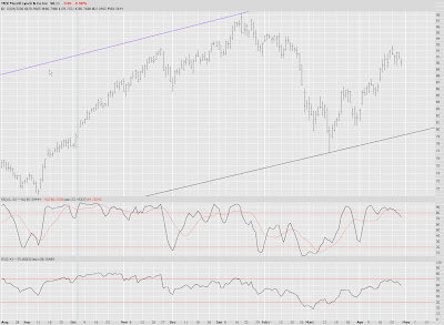 The NASDAQ Composite, which has been weaker than the Dow, also fell. The key difference is that it was down pretty much all day, whereas the Dow sported a 40+ point gain at one point in the day before shriveling away.