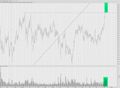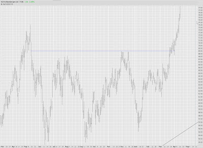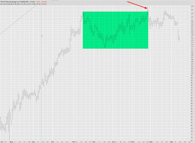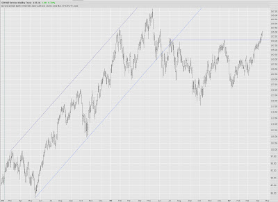 I really tried to look at the whole market with a very open mind, because the strength of the bulls since July has been frustrating, confusing, and vexxing. I keep coming back to the graph below, which shows the S&P 500 over the long haul. I simply cannot see that we are set up for a bullish surge. I don't want to hear about liquidity, the global economy, or the trillion dollar oil surplus seeking a home. This blog is about charts, and the charts, to me, don't say "buy."