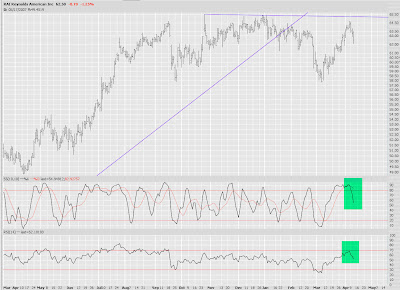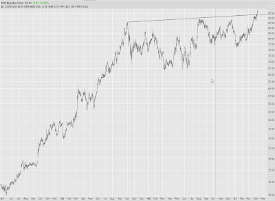 It's the same story I've been citing on the major indexes. Although we're pushing higher and higher, we're still under that major trendline that was broken on February 27th. I've circled the highest target area. Of course, if we cross above that tinted zone (the former high in February), it's time to return to aluminum siding sales, door-to-door.