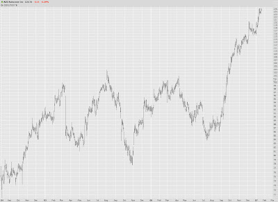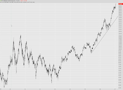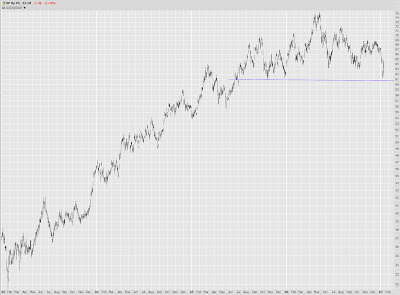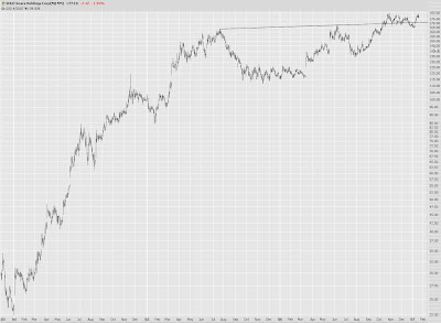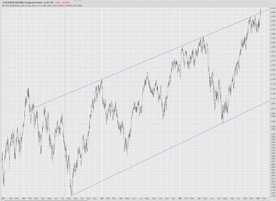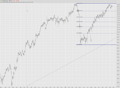Some indexes pushed to lifetime highs intraday today, but ran out of steam. I do not see any sensational, obvious, the-world-is-coming-to-an-end type pattern. If the market falls, it's going to do so simply because there are no more Greater Fools. As for the S&P 500, shown below, it needs to break below 1,400 before things get interesting.
