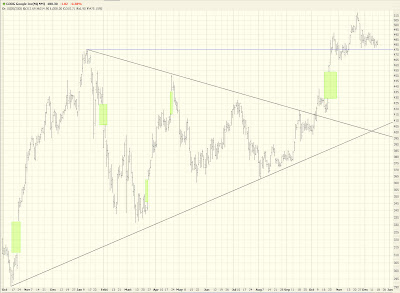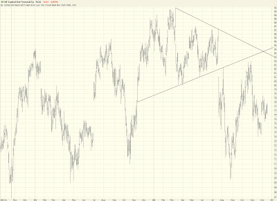 The market did what I wanted it to do today (for a change), which is push higher, get the bulls excited, and then dash their hopes. Nothing makes my day more than a disappointed bull. The markets were down across the board, particularly in the world of gold and oil. The MidCap 400 did not break above the horizontal line shown here, indicating a possible failed pattern.