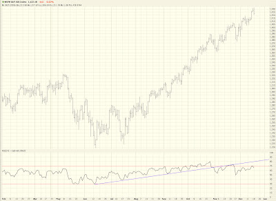 And here is the S&P 500, the only stock index on which I own puts right now (and a disturbingly large amount). We see how the RSI pulls farther away from the failed trendline. |