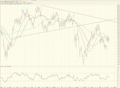 Let me be clear: even though I have access to every indicator under the sun, I use hardly any of them. I'm a simple soul. I'm interested in (1) patterns (2) trendlines (3) Fibonacci studies. That's really about it. I've been tossing in some RSI here and there to spice things up a bit, but honestly, if you're looking for something like the graph below, you might be better off hanging out at the public chart site of StockCharts.com (which is where this graph is from):