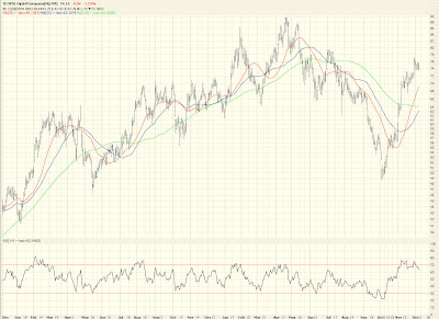 Let me be clear: even though I have access to every indicator under the sun, I use hardly any of them. I'm a simple soul. I'm interested in (1) patterns (2) trendlines (3) Fibonacci studies. That's really about it. I've been tossing in some RSI here and there to spice things up a bit, but honestly, if you're looking for something like the graph below, you might be better off hanging out at the public chart site of StockCharts.com (which is where this graph is from):