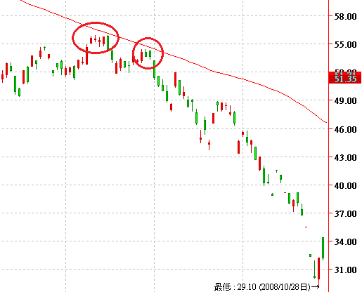 第一招:股票跌破季线后,反弹到靠近季线时在当天的收盘放空,如果隔天收盘涨过季线就停损。原因是股票跌破季线代表这三个月买进的投资人平均是套牢的,当股票涨回到快碰到季线的时候会有解套卖压(就是套牢的投资人看到快涨回成本所以想先一步把股票卖掉,你卖我也卖就形成一股卖压,称之为解套卖压),如果意图抢反弹的买方力道不及想解套的卖方力道,那后面跌幅还有一大段在等着。如图