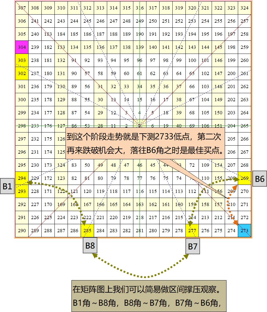 下星期我们观察的价格支撑当然是刚越过的B1角,6/21高点到301,进入B2角,那么,回调就不能再跌破B1角。上压在B3角312部位。 -------------- 江恩矩阵图1群-股票 327968136 江恩矩阵图2群-股票 467787182 江恩矩阵图3群-外盘/期货 545055493 --------------- 江恩矩阵图基本学习--新手专辑-18堂课-前五堂课免费 https://www.cctalk.com/m/course/135447