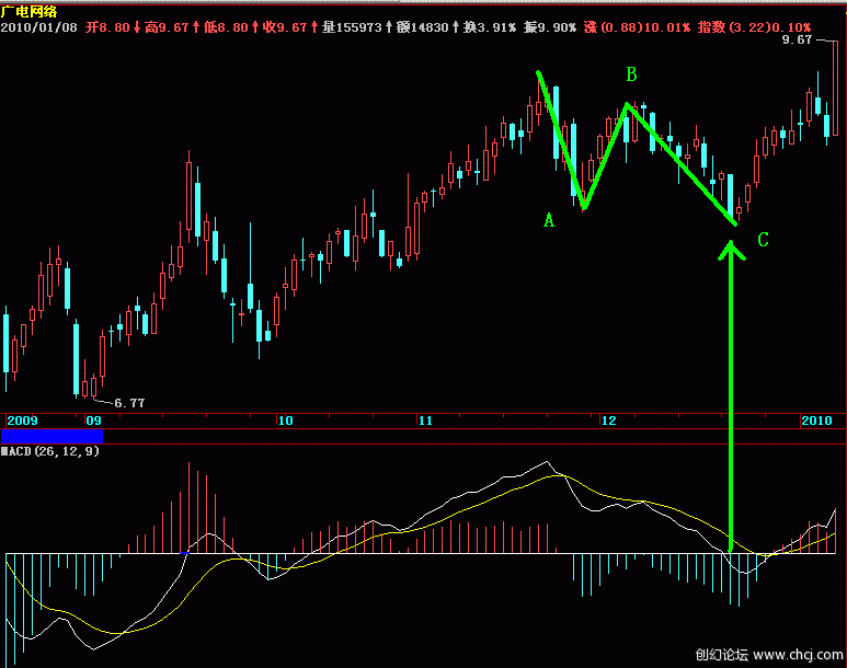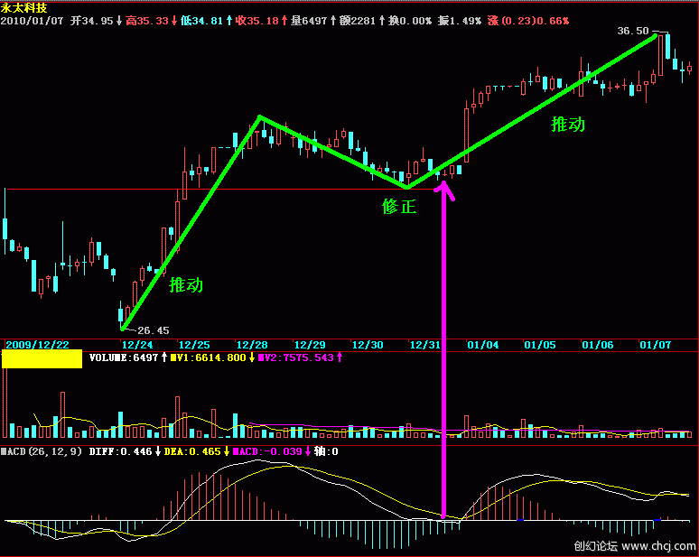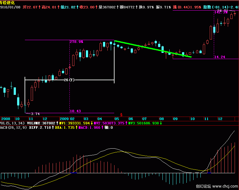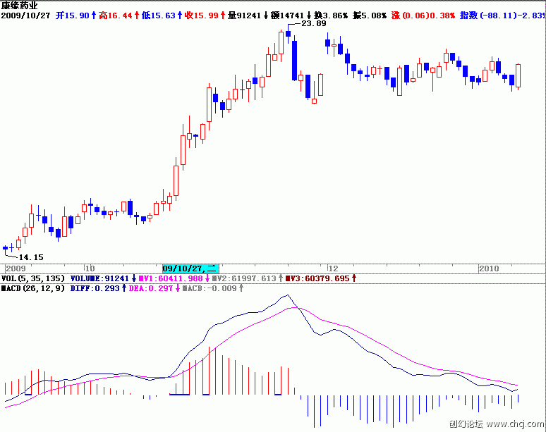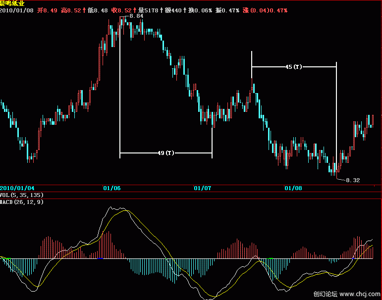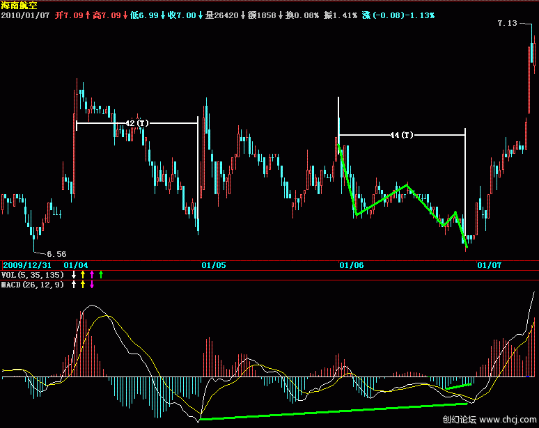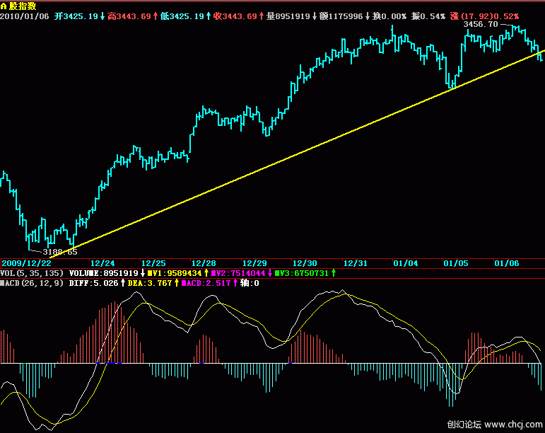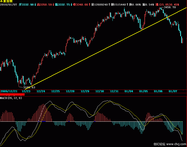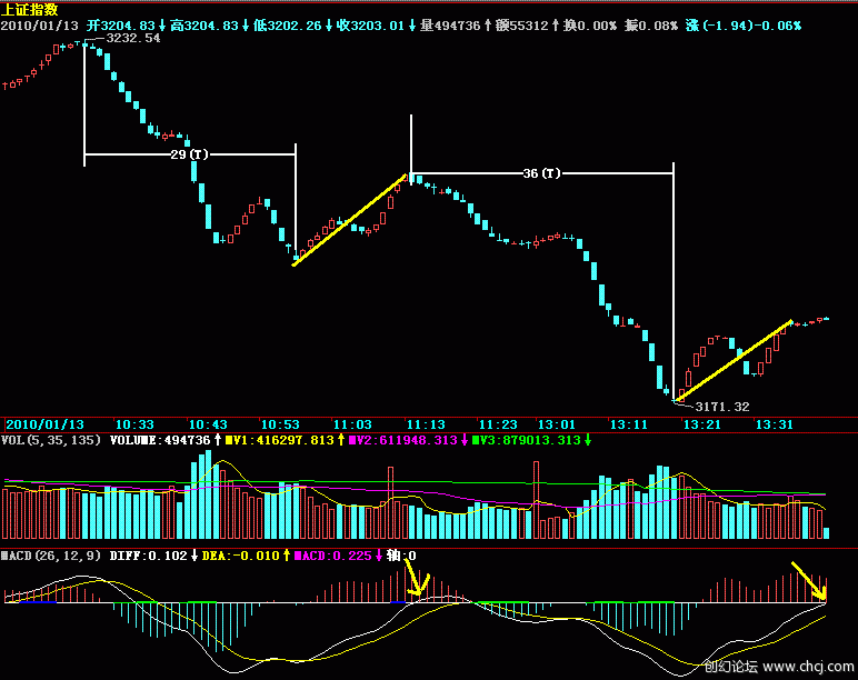 唯一的一个买入条件就是等待右侧交易,但是,也不用画那么大级别的趋势线,连接1月6号和1月12号的高点,要求出现一根阳线突破该趋势线,并且把今天k线吞并即可。右侧交易的好处是确认性强。本文来自:创幻论坛 http://www.chcj.net 讲了这么久,刚刚讲到macd回零轴的问题,不管研究走势结构,分型,还是指标,都要知其然亦知其所以然。整体macd能解决如下问题,趋势方向,买卖点,加速点,多空衰竭点。当然,这里要套用级别分析,因为整体走势图是立体的。三维的。如果大家再稍微理解一点时间周期,空间循环的概念,在操作中,就会更加方便和实用。