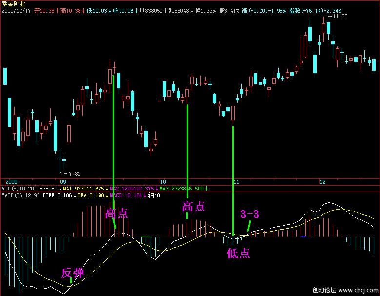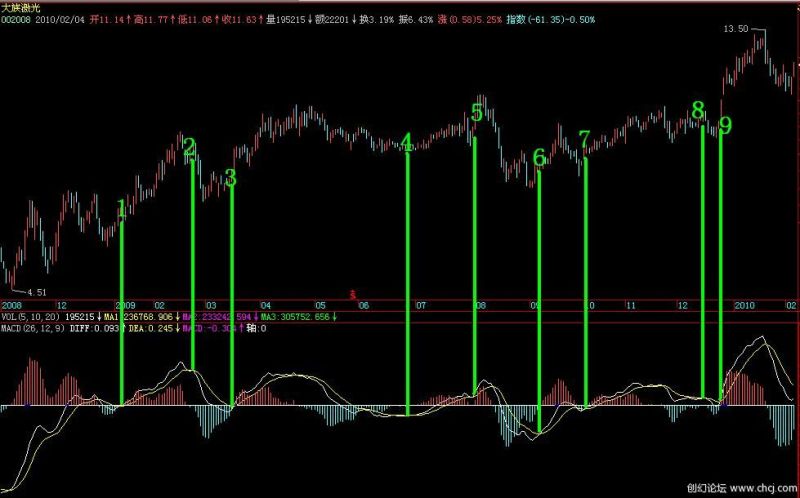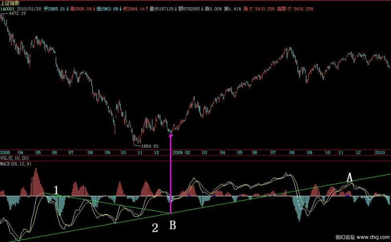 线1和线2产生焦点,对应的是08年12月31号。精确提示了一个低点。实际上macd是可以预测时间的。同样,macd也可以预测价格,比如,通过计算指标线之间的乖离率,来预测未来高点或低点的价格。