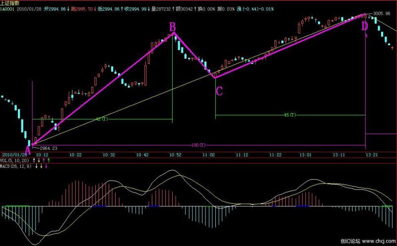这里发的是昨天(2010-1-28) 上海大盘的1分钟图。图中分别提示了转折点B C D。配合macd指标来看。很清晰易懂。按照这种思路来分析,每天盘中重要高低点,是可以马上判断出来且确认。