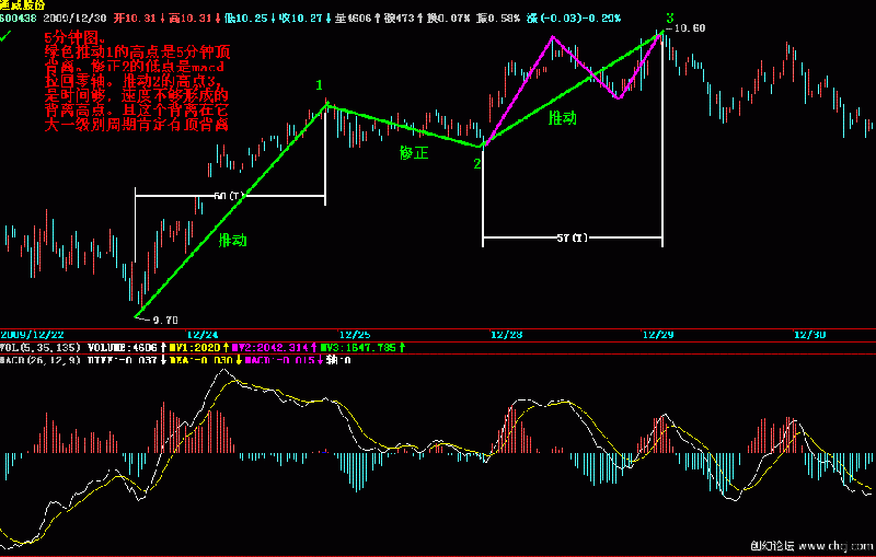 绿色段的上下上走势,第一段上涨的高点是形成5分钟顶背离。形成顶背离后就要走修正,既趋势的停顿。这个修正是把macd的指标线拉回零轴。第二段上涨跟第一段上涨时间差不多,但是,速度差很多,就形成了大级别的顶背离高点。同时,他的内部紫色段上涨,属于时间不够速度够类型的。且macd顶背离。就可以确定,本周期和大一级别周期同时产生顶背离。那这个高点级别是15分钟级别的