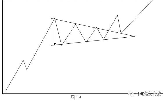 1、对称三角形(图19):它显示出两条会聚的趋势线,上边线下降而下边线上升,如先前的趋势向上,则三角形巩固形态之后市场向上的可能性大;如先前的趋势的向下,那么对称三角形就有看跌的含意。