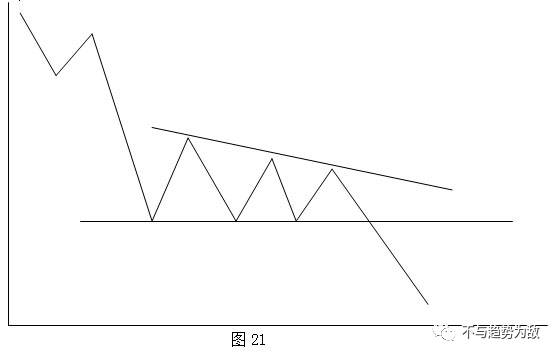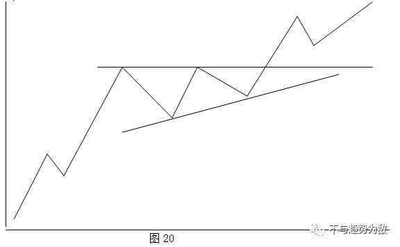 2、上升三角形(图20):它显示出两条会聚的趋势线,上边线水平而下边向上升,说明买方比卖方更为积极主动。它被认为是看涨形态,通常以向上的突破告终。