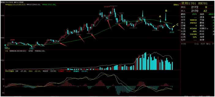 比如:100万的资金最大回撤比例为20% ,那么20万的亏损空间,可以分成40份,也就是每笔交易最大亏损额为5000,至于仓位则是根据最大亏损额度来配比,计算公式为:5000/止损空间 例如RM1701 取用最近走势带来的机会举例, A:日K级别空头延续机会 。B:日K级别空头延续机会。C:1H级别空头延续机会。