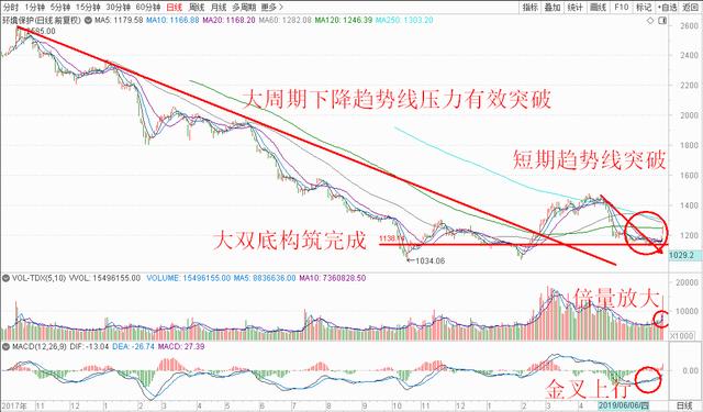 一、盘面回顾 深沪两市股指在绝大多数行业细分指数全线走高、北上资金继续规模性流入、美联储维持既定利率不变并释放鸽派消息、以及国内持续不断的利好消息刺激下,给出逆转前一交易日的放量大阳线,为有利多头趋势看高一线的积极信号。 行业方面,环境保护、证券、保险、多元金融、酿酒、水务、供气供热、旅游、家用电器、酒店餐饮、船舶、造纸、软件服务、运输服务、电器仪表、日用化工、建材、商贸代理等为代表的主线板块放量大涨,资金关注度显著提升,形成平均波动率超过2.16%的向上突破走势,佐证两市股指仍有脉冲高点机会。 二、指数分析 指数方面,环境保护指数大涨超过6%,为政策利好+大周期技术双底强支撑共振作用使然。日线图表看,该指数大周期下降趋势线压力有效突破,小双底蓄势后大阳线倍量上攻,配合MACD指标的金叉上行良好走势,预期后市还有脉冲突破250日线压力的动能和势能。 环境保护日线分析图解