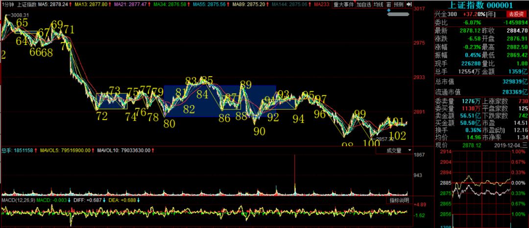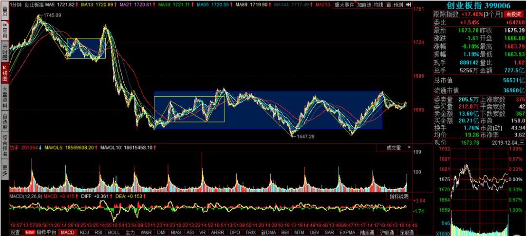 创业板上,围绕前面的一分钟级别中枢升级为五分钟级别中枢,接下来就是按这个五分钟级别中枢的走势级别划分了。