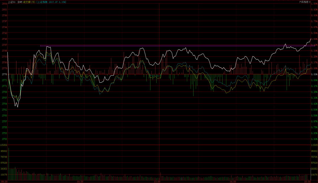 尾盘买盘有所增多(其中北上资金净流入逾35亿元),沪指分时突破了收敛三角形: 上证50分时刷新了日内高点,显然,主力资金有所“护盘”: