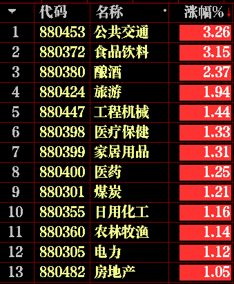收红的行业板块比午间增多到25个,公共交通、食品饮料收涨超过3%,另有11个涨幅超过1%: