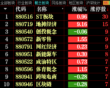 今天,地摊经济概念股获得了16只涨停。 通达信行情软件概念板块涨停数排序,地摊经济仅次于ST: