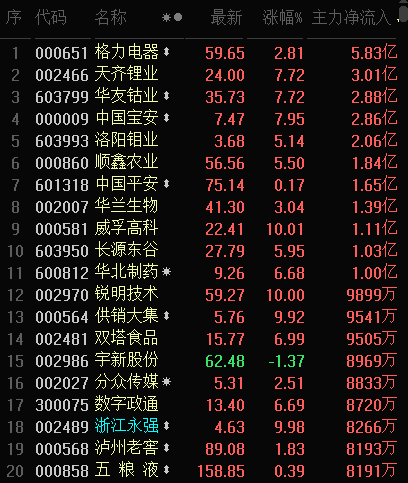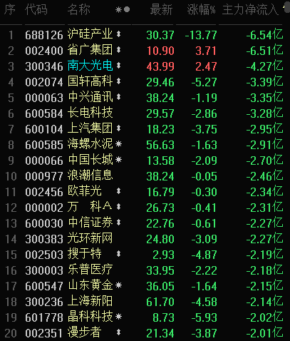 主力资金净流入超亿元个股仅有11只,而净流出超亿元个股多达66只。