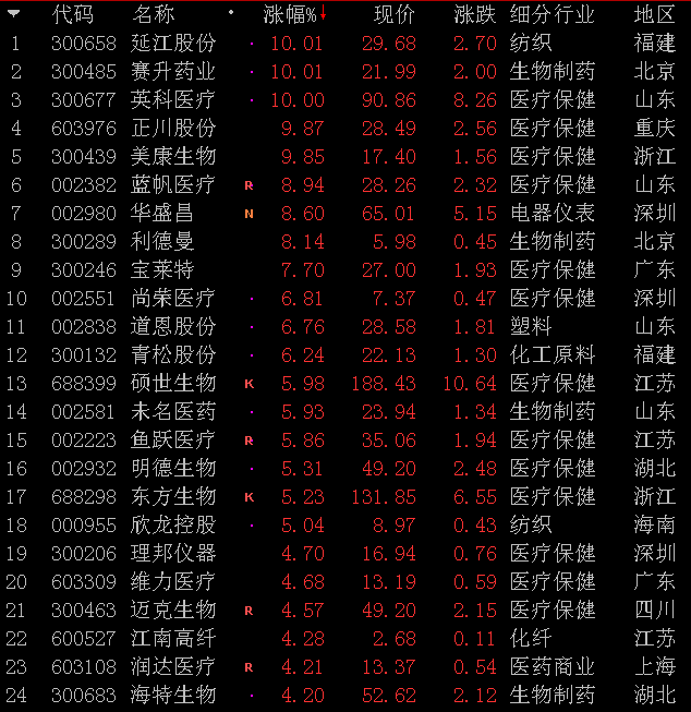 新型病毒防治涨幅4%以上个股: