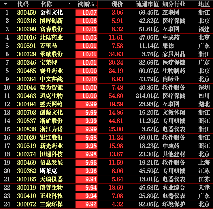 创业板有103只涨幅4%以上,其中涨停24只,占两市涨停总数接近一半。