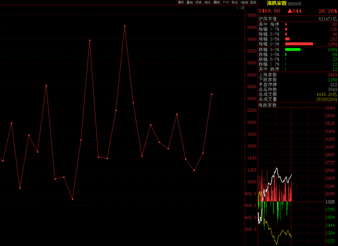 因而,今天上午成交量较上周五上午有所放大,沪市放大80亿元,深市放大277亿元。个股涨跌比2469:1168,涨停58只,跌停12只。涨跌家数指标摆脱了前8天的颓势,上行到中位偏上。