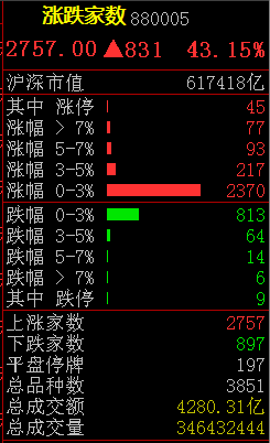 第四、涨跌家数分时看,上涨个股数量在开盘时最高,之后缓慢减少,这是部分资金借高开减仓或卖出的表现。上午收盘,个股涨跌比2757:897,涨停45只不算多,跌停9只处于正常状态。