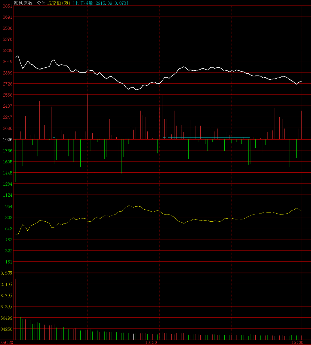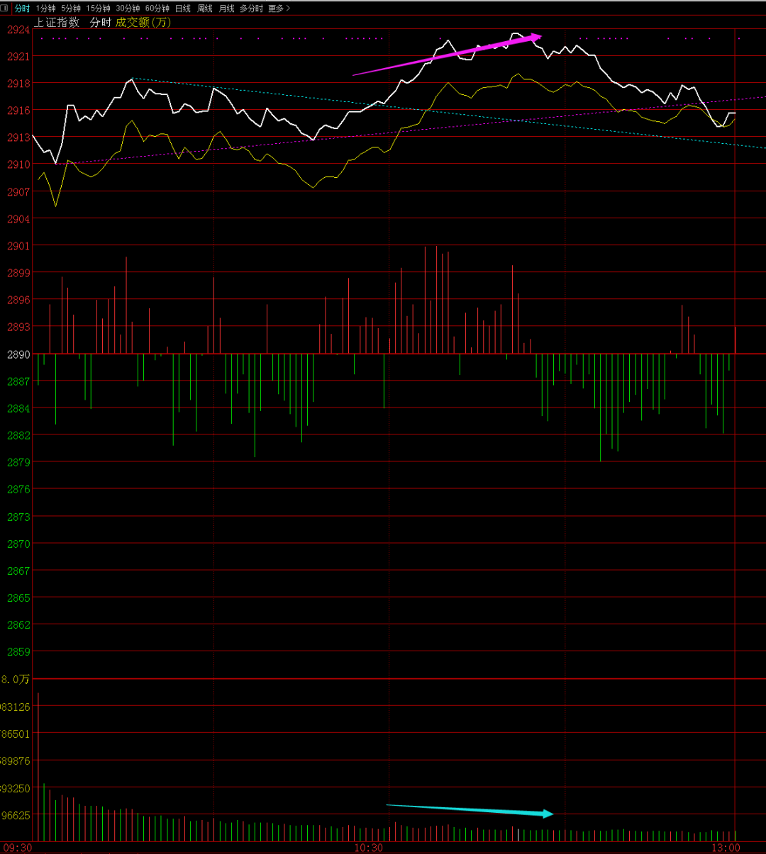 第二、指数分时的上涨并未伴随成交量的放大,相反却又是量缩价升。