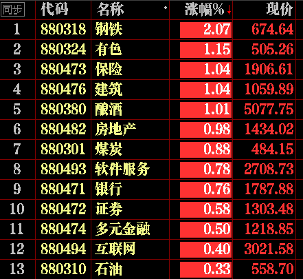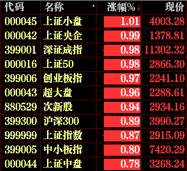上午A股各主要指数全部收涨,最大涨幅是上证小盘+1.01%,最小涨幅是上证中盘+0.78%。