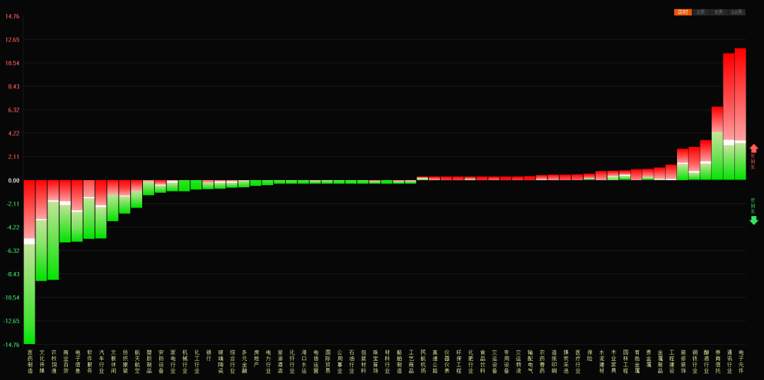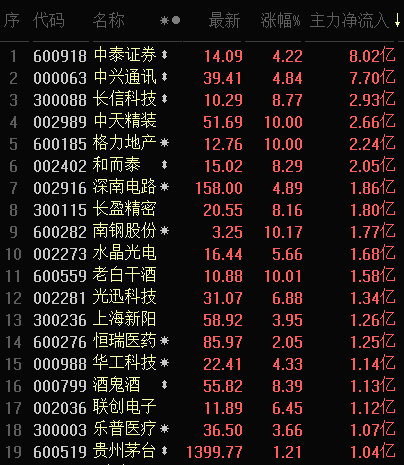 从资金流向看,今天出现了一个好苗头——主力资金净流入行业板块前三是电子元件、通讯行业、券商信托,这在之前是持续净流出;昨天涨得好的几个板块今天上午资金净流出靠前——又是超短线操作。