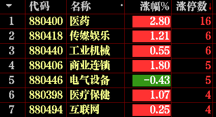今天市场有一个集中热点表现在受益疫情的板块。行业板块中,医药、医疗保健分别有16、4只涨停。传媒娱乐、工业机械、商业连锁、电气设备、互联网也有一些好表现。