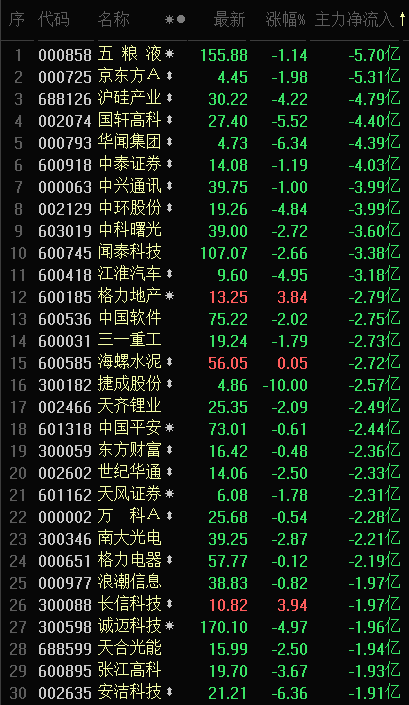 主力净流出个股前十:五粮液、京东方A、沪硅产业、国轩高科、华闻集团、中泰证券、中兴通讯、中环股份、中科曙光、闻泰科技(主力资金净流出超亿元个股多达75只)
