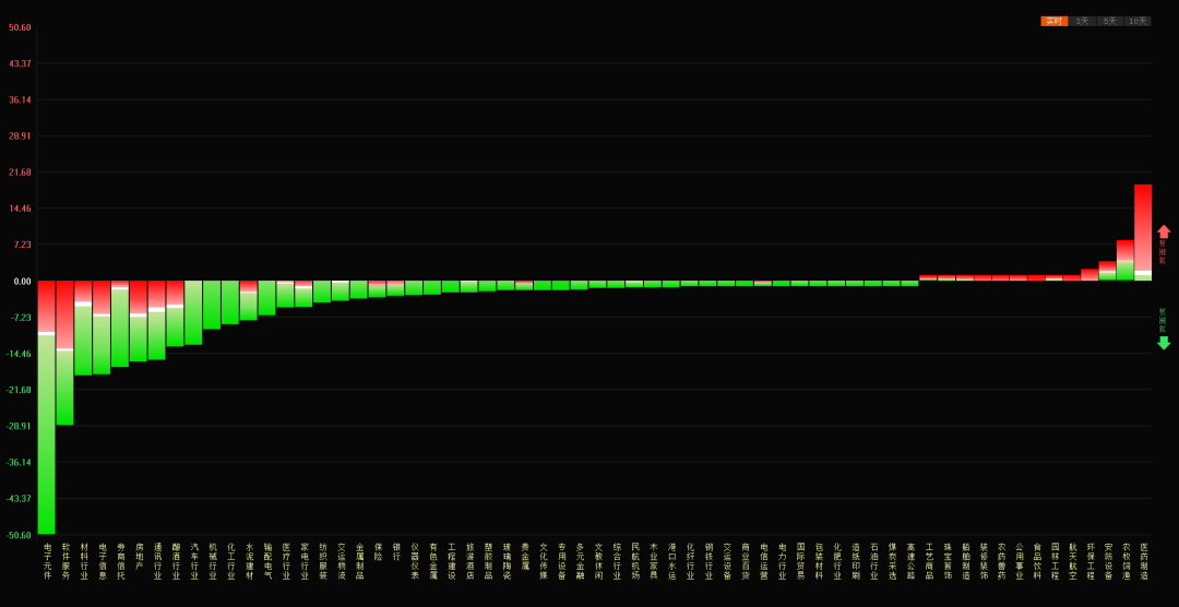 主力净流入行业板块前五:医药,中药,创新药,食品,动物保健; 主力净流入概念板块前五:健康 CHN,禽流感,乡村振兴,5G消息/RCS,转基因; 主力净流出板块前五:电子元件、软件服务、材料行业、电子信息、券商信托;