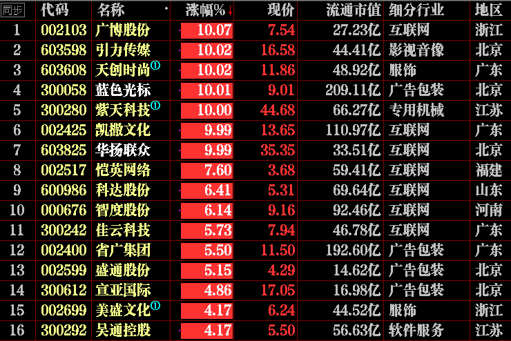 在今天的字节跳动概念板块中,有16只涨幅4%以上,其中涨停7只,龙头凯撒文化8天7板,华扬联众、天创时尚3连板,广博股份结束回调返身涨停,引力传媒拉直线涨停突破平台,蓝色光标突破77日的平台涨停,紫天科技更是12连阳。